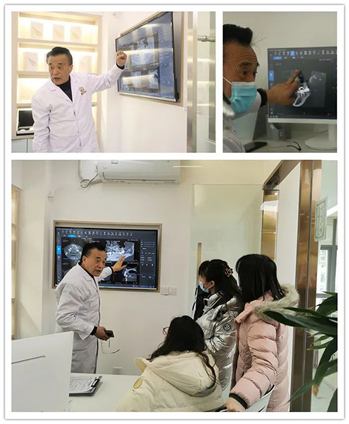△种植专家青华主任正在详细为顾客讲解方案,配合大屏的CT片,顾客能很直观的看到自己颌骨情况。专业!大气!